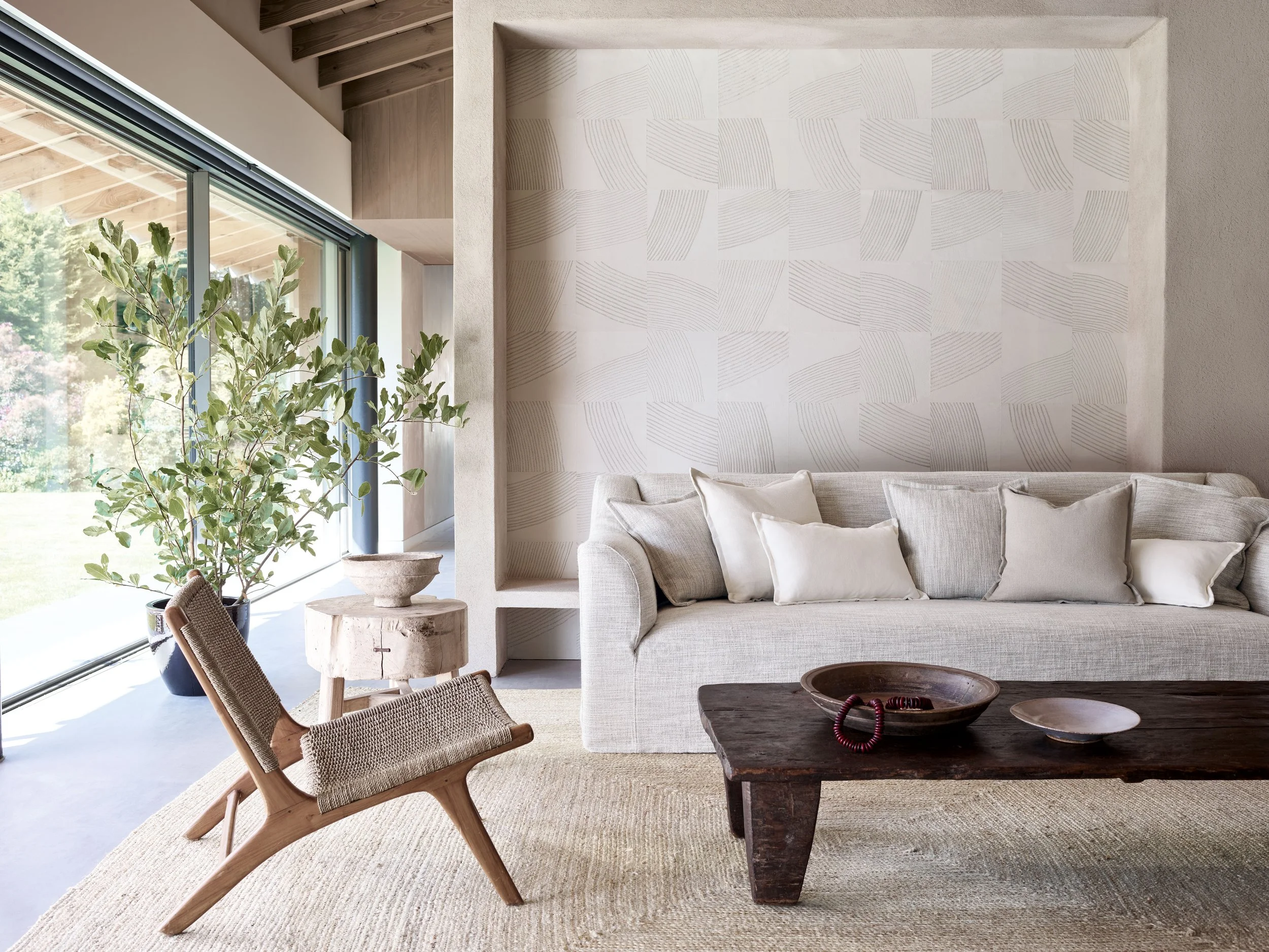 Relaxing colour palette of whites, blues, and greys, earth tones to create a tranquil atmosphere.
