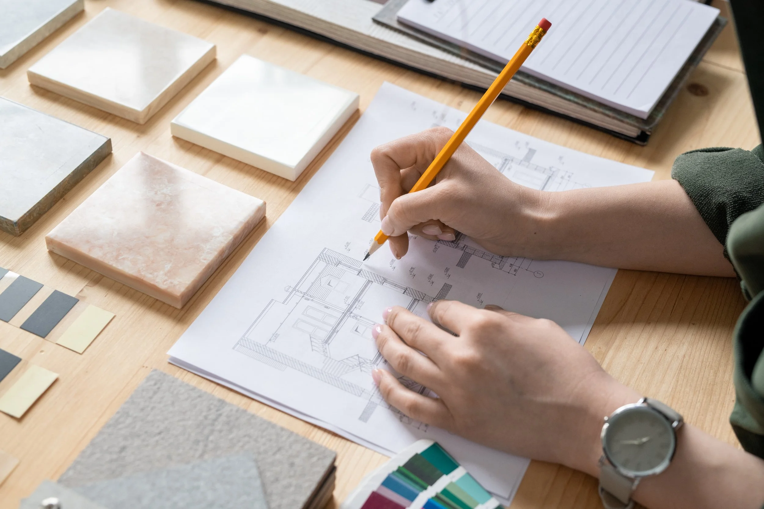 This is where we get to work on creating floor plans, talking to our trade partners, and coming up with a completely tailored design by sourcing everything from fixtures to finishes for your space that we’ll present to you. We also offer a luxurious Kitchen and bathroom design service that we can supply and fit with our trade partners. We can also work on technical drawings and details for any construction work on the project and liaise with any relevant construction trades such as electricians, plumbers, tilers, or specialist trades such as architectural joinery, and bespoke built-in furniture to ensure the overall design is followed through.